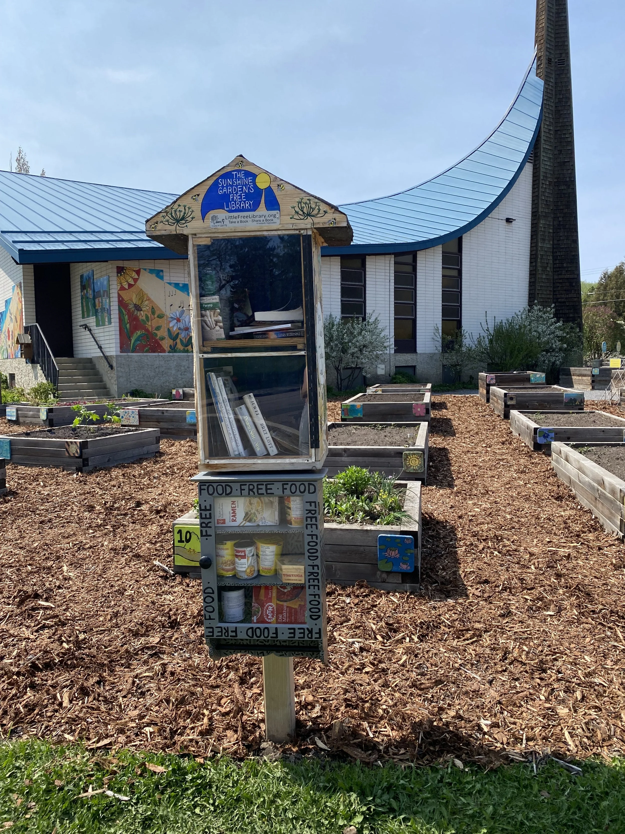 The Free Food Box is located below the Free Library at the Sunshine Garden. Please leave some food if you are able, and take some food if you require.
